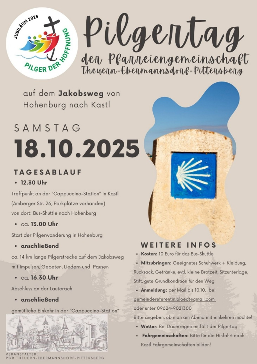 Pilgertag Am 18. Oktober findet wieder ein Pilgertag statt. Treffpunkt ist um 12.30 Uhr an der Cappuccino Station in Kastl. Von dort aus bringt uns ein Bus zum Ausgangspunkt nach Hohenburg. Auf der ca. 14km langen Strecke des Jakobsweges wollen wir gemeinsam pilgern und uns zum Thema „Hoffnung“ Gedanken machen. Am Abend kehren wir in die „Cappuccino-Station“ in Kastl ein. Anmeldung bis zum 10.10. bei GR Kathrin Blödt (gemeindereferentin.bloedt@gmail.com). Bitte angeben, ob man mit zum Essen geht. Nähere Infos finden Sie auch auf dem Plakat. |