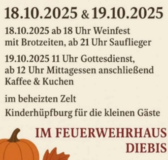 Einladung zum Wein und Erntedankfest in Diebis am Samstag, 18. Oktober und Sonntag, 19. Oktober Liebe Freunde, Nachbarn und Gäste, wir laden Euch herzlich ein, gemeinsam mit uns ein Wein- und Erntedankfest in Diebis zu feiern! Freut Euch auf zwei festliche Tage voller Geselligkeit, guter Stimmung, kulinarischer Genüsse und natürlich feiner Weine. Lasst uns gemeinsam die Früchte des Jahresund die Schönheit des Herbstes genießen |