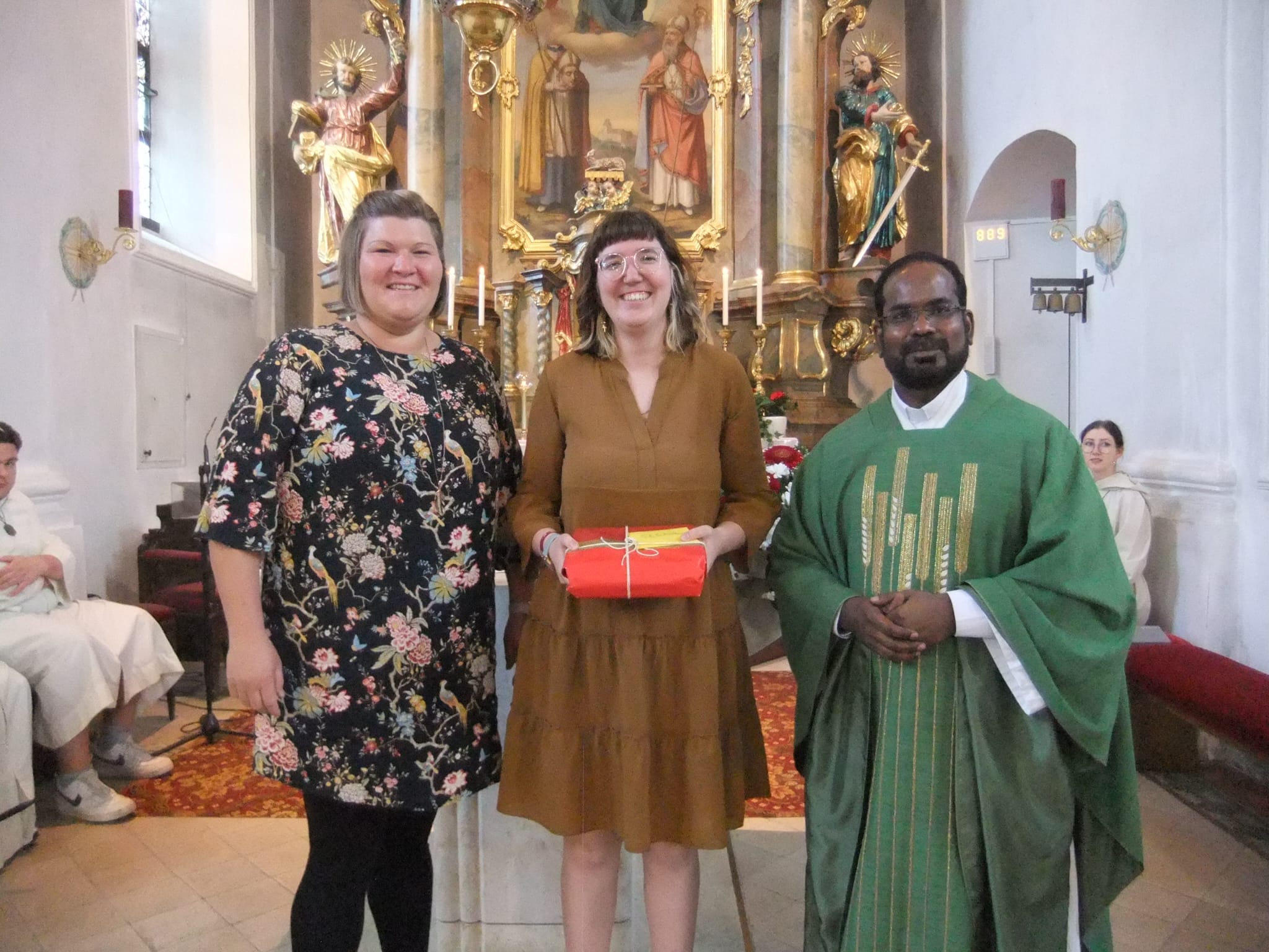 Gleich mehrere Anlässe kamen diesmal im Zuge des Vorabendgottesdienstes zusammen, die die Pfarreiangehörigen, wie auch Gäste, auch zu Gottesdienstbesuchern werden ließen. Die Nikolauskirche mit Festgottesdienst und Familien war deshalb gut besucht. Die Pastoralpraktikantin Elena Weniger wurde nach einem Jahr pastoralem Einsatz für die drei Orte Ebermannsdorf, Theuern sowie Pittersberg verabschiedet, vom Bistum Regensburg wurde ihr künftig ab dem 1.September 2023 die Pfarreiengemeinschaft Klardorf mit Wiefelsdorf sowie Naabeck zugewiesen zur Unterstützung des dortigen Pfarrers Maier. Den Gottesdienst gestaltete wieder einmal die Pittersberger Gruppe "Miteinander," die es verstand, mit Rythmusliedern die Gläubigen zum Mitsingen zu motivieren. Seelsorger Sagai sowie Gemeindereferentin Katrin Blödt lobten und dankten Frau Weniger für ihren engagierten Einsatz sowie für ihr dabei gezeigtes Verantwortungsbewusstsein, wie Frau Blödt meinte. Für alle Gläubigen der drei Pfarreien und die Pfarreiverantwortlichen sei es eine Bereicherung gewesen, mit ElenaWeniger zum Wohle aller zusammen zu arbeiten. |