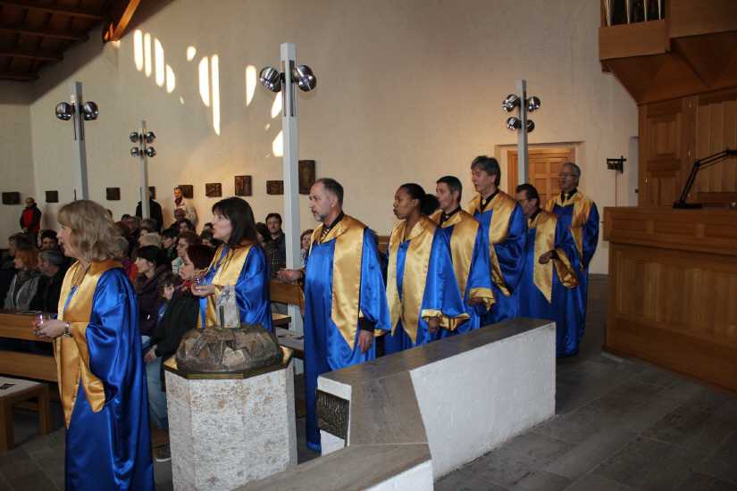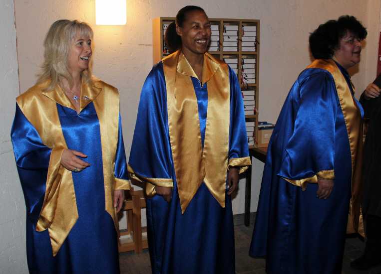 Schienen die Zuhörer während der ersten halben Stunde noch auf den Bänken zu kleben und sich in der Andacht eines Gottesdienstes zu wähnen, löste sich diese Starre zunehmend auf und die Leute ließen sich anstecken vom Rhythmus des Chores. Der Powerfrau Remona Fink, die an der Spitze der oberpfalzweit einzigartigen Formation steht, gelang es einmal mehr, mit ihrer Truppe ein Gotteshaus zum Klingen zu bringen und die Freude spürbar werden zu lassen. Hausherr Pfarrer Herbert Grosser begrüßte die singenden und die zuhörenden Gäste und freute sich über das volle Haus. Die Sängerinnen und Sänger glänzten nicht nur in ihren blauen Roben mit den goldenen Stolas, die Akteure verstanden es wirklich, echte Hoffnung und Freude – Hope and Joy – zu verbreiten. Ihre Choreografie wirkte zu keiner Zeit einstudiert, wohl aber extrem ansteckend. Ob beim meditativen, sanften Wiegen mit geschlossenen Augen oder beim rhythmischen in die Hände klatschen – das Herzblut aller war immer dabei.