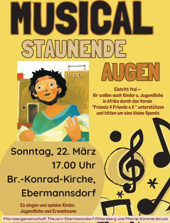Nach der erfolgreichen Aufführung des Musicals im letzten Jahr in Kümmersbruck möchten wir das Musical "Staunende Augen" auch in unserer Pfarreiengemein-schaft zur Aufführung bringen. Kinder, Jugendliche und Erwachsene aus Theuern-Ebermannsdorf-Pittersberg und Kümmersbruck bringen Musik, Freude und eine berührende Botschaft auf die Bühne.